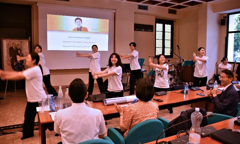 L’incontro è cominciato alle 17 con lo Youth Gathering, a cui hanno preso parte 78 persone. Dopo i saluti di apertura dal Leader Nazionale Gukson Capone e del Direttore Subregionale dell’Europa del Sud-ovest, la Holy BandIT, una band formata da seconde generazioni, ha suonato numerose canzoni spirituali e di lode, elevando l’atmosfera. L’Accademia Youngson si è esibita con la Mujokon Dance. Alcune persone hanno poi condiviso come sia facile provare connessione tra persone e avvicinarsi attraverso la musica.